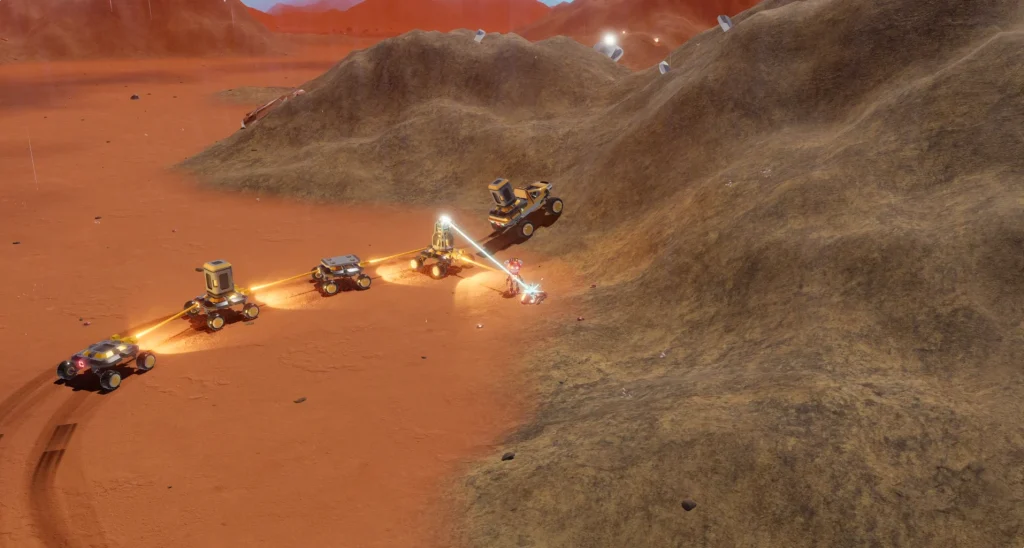 Вдобавок, ресурсы нужно добывать вручную или с помощью техники, а после — перерабатывать на 3D-принтерах в новые детали и конструкции. Энергетическая сеть между базами требует внимания, между тем мобильные роверы позволяют перемещать производство куда угодно.
